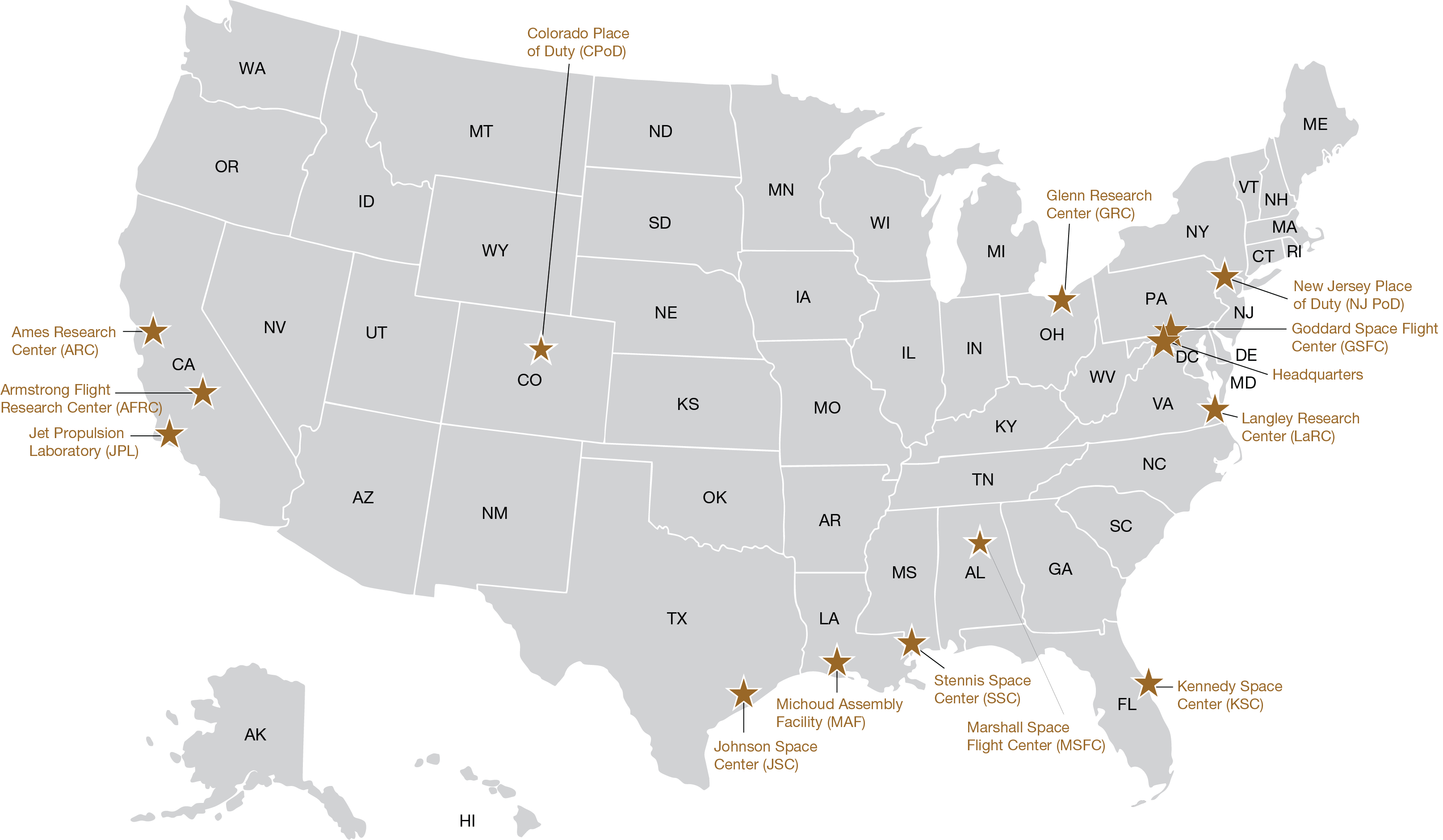 Map of the United States with the NASA OIG locations: Glenn Research Center (GRC), New Jersey Place of Duty (NJ PoD), Goddard Space Flight Center (GSFC), Headquarters, Langley Research Center (LaRC), Kennedy Space Center (KSC), Marshall Space Flight Center (MSFC), Stennis Space Center (SSC), Michoud Assembly Facility (MAF), Johnson Space Center (JSC), Jet Propulsion Laboratory (JPL), Armstrong Flight Research Center (AFRC), Ames Research Center (ARC), and Colorado Place of Duty (CPoD).